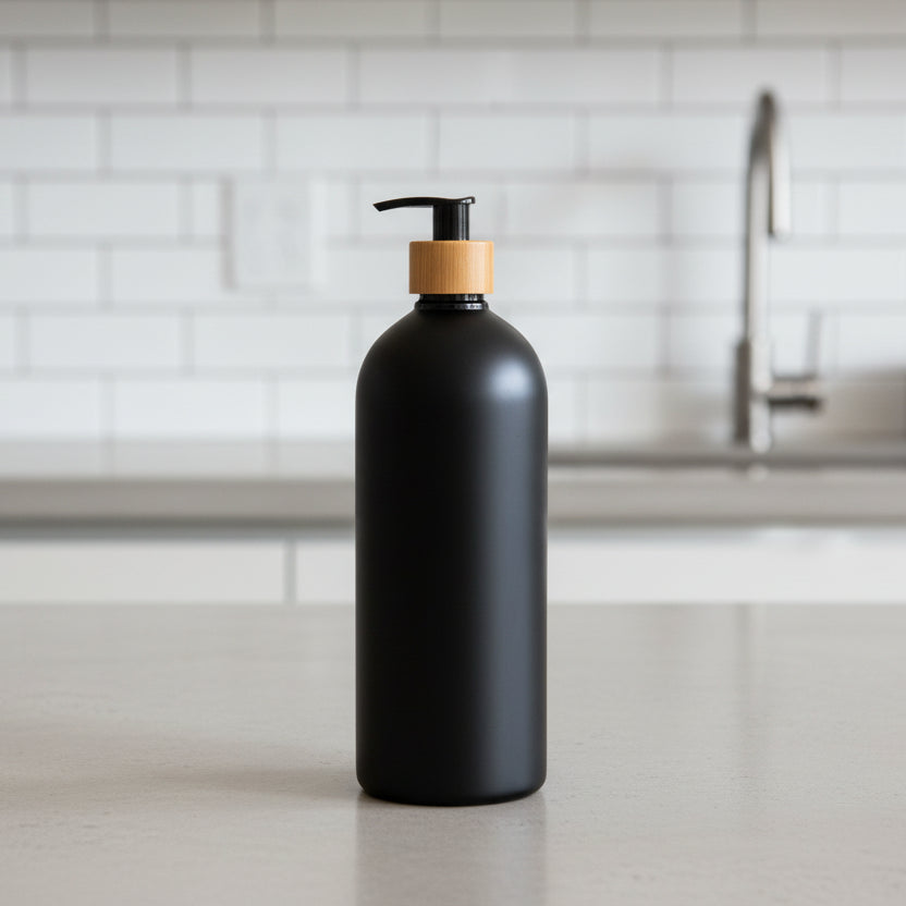 Transform your bathroom with our 1 L Black Pump Bottle. Designed for a modern, coordinated look, this refillable bottle is perfect for shampoo, conditioner or body wash. The matte black finish paired with a bamboo screw-top pump adds elegance and simplicity to your bathroom routine. Labels not included.