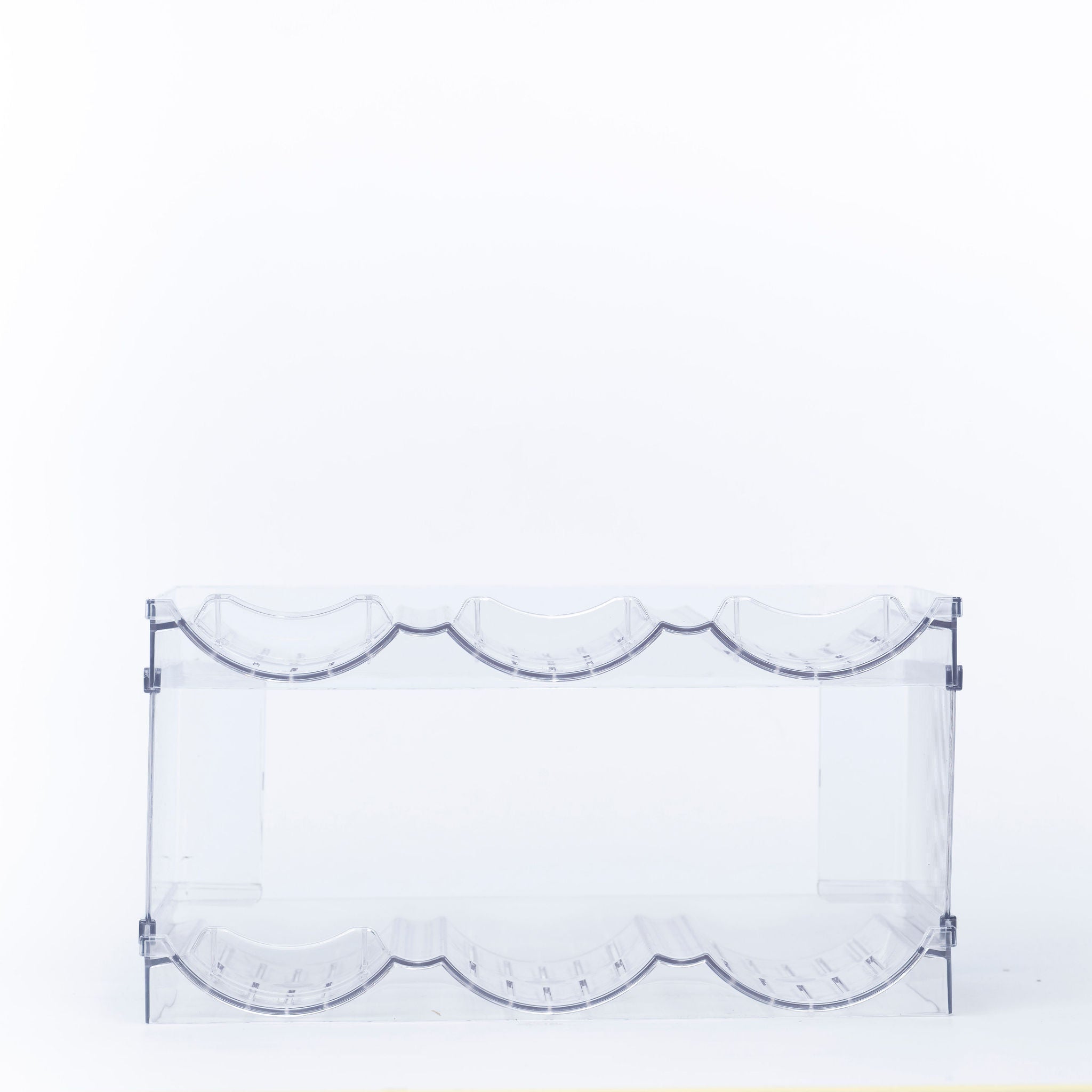 Made from clear, durable PET plastic with anti-slip rubber tracks, it holds bottles securely in place and stacks easily to maximise vertical storage.