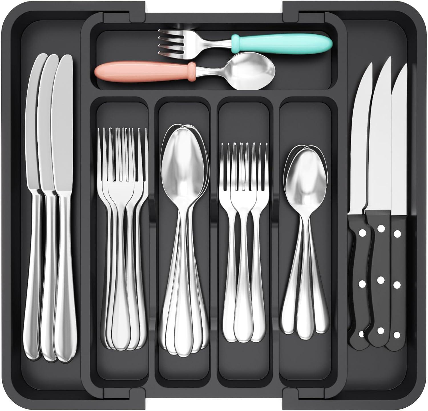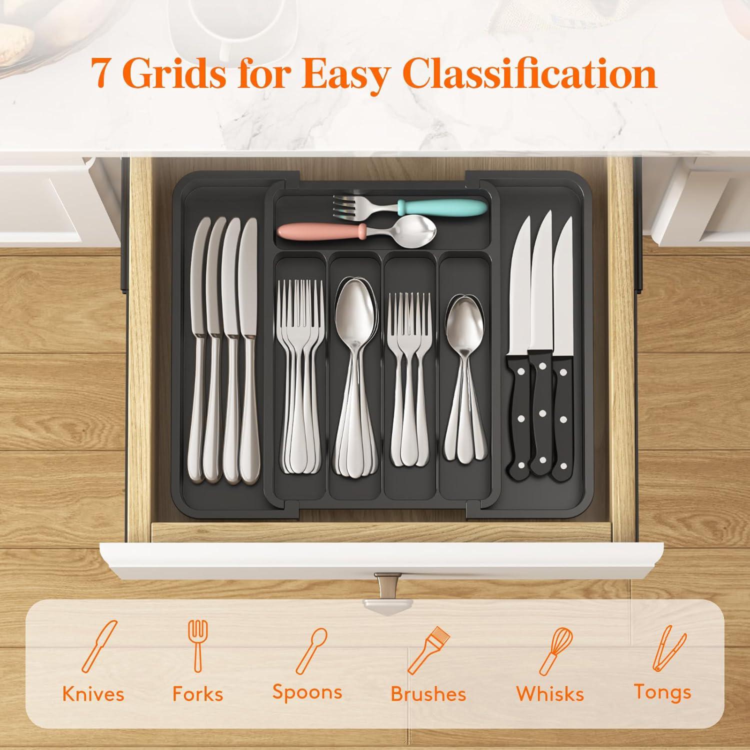 Expandable Black Cutlery Drawer Organiser – 7 Slot Tray